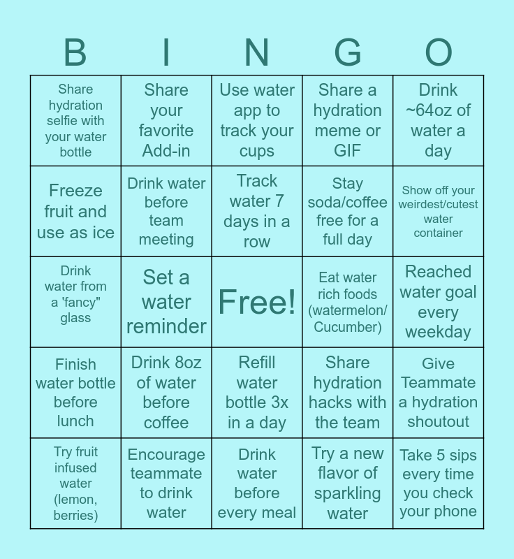 This bingo card has a free space and 24 words: Drink 8oz of water before coffee, Encourage teammate to drink water, Track water 7 days in a row, Try fruit infused water (lemon, berries), Drink ~64oz of water a day, Share hydration selfie with your water bottle, Freeze fruit and use as ice, Share your favorite Add-in, Eat water rich foods (watermelon/ Cucumber), Refill water bottle 3x in a day, Stay soda/coffee free for a full day, Drink water from a 'fancy" glass, Share hydration hacks with the team, Give Teammate a hydration shoutout, Drink water before team meeting, Try a new flavor of sparkling water, Reached water goal every weekday, Use water app to track your cups, Show off your weirdest/cutest water container, Set a water reminder, Take 5 sips every time you check your phone, Finish water bottle before lunch, Share a hydration meme or GIF and Drink water before every meal.