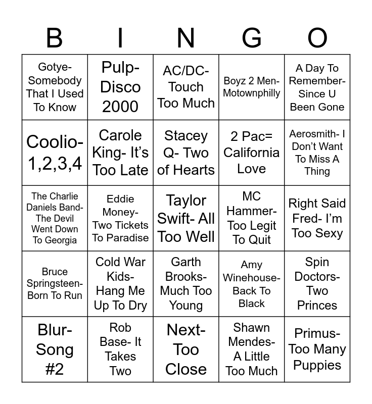 This bingo card has 30 words: Rob Base- It Takes Two, Sublime- Smoke Two Joints, Eddie Money- Two Tickets To Paradise, Hozier- Too Sweet, Gotye- Somebody That I Used To Know, AC/DC- Touch Too Much, Carole King- It’s Too Late, Garth Brooks- Much Too Young, MC Hammer- Too Legit To Quit, Next- Too Close, Right Said Fred- I’m Too Sexy, Taylor Swift- All Too Well, Shawn Mendes- A Little Too Much, Primus- Too Many Puppies, Aerosmith- I Don’t Want To Miss A Thing, Adele- Set Fire To The Rain, Amy Winehouse- Back To Black, Bruce Springsteen- Born To Run, Cold War Kids- Hang Me Up To Dry, A Day To Remember- Since U Been Gone, The Charlie Daniels Band- The Devil Went Down To Georgia, Blink 182- All The Small Things, Pulp- Disco 2000, 2 Pac= California Love, Coolio- 1,2,3,4, Boyz 2 Men- Motownphilly, Spin Doctors- Two Princes, Blur- Song #2, Stacey Q- Two of Hearts and Guns N Roses- Welcome To The Jungle.