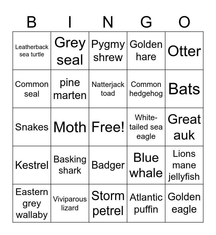 This bingo card has a free space and 24 words: Basking shark, Viviparous lizard, Natterjack toad, Eastern grey wallaby, Otter, Leatherback sea turtle, Common seal, Grey seal, White-tailed sea eagle, Badger, Common hedgehog, Snakes, Blue whale, Lions mane jellyfish, pine marten, Atlantic puffin, Great auk, Pygmy shrew, Bats, Moth, Golden eagle, Kestrel, Golden hare and Storm petrel.