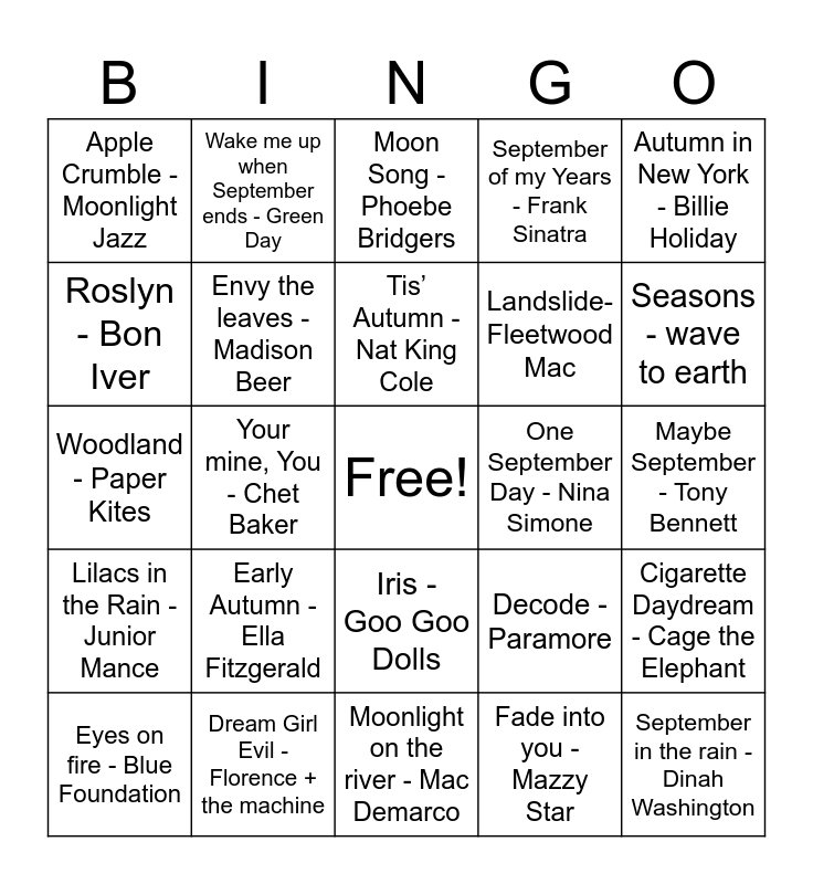 This bingo card has a free space and 41 words: Sweater - Spencer Sutherland, Woodland - Paper Kites, Flowers in the Window - Travis, Envy the leaves - Madison Beer, Dream Girl Evil - Florence + the machine, Iris - Goo Goo Dolls, Tis’ Autumn - Nat King Cole, Sunrise - Norah Jones, Autumn in New York - Billie Holiday, Lilacs in the Rain - Junior Mance, Your mine, You - Chet Baker, September of my Years - Frank Sinatra, September in the rain - Dinah Washington, Maybe September - Tony Bennett, One September Day - Nina Simone, Early Autumn - Ella Fitzgerald, Autumn Leaves - Nat King Cole, Apple Crumble - Moonlight Jazz, Autumn Embrace - Novo Stella, Moon Song - Phoebe Bridgers, Cigarette Daydream - Cage the Elephant, Bookstore Girl - Charlie Burg, Moonlight on the river - Mac Demarco, Landslide- Fleetwood Mac, Apples, Peaches, pumpkin - Jay and the Techinques, Georgia on my mind - Ray Charles, Fade into you - Mazzy Star, September - Earth Wind and Fire, Seasons - wave to earth, Apple Cider - beabadoobee, Cardigan - Taylor Swift, Wake me up when September ends - Green Day, Eyes on fire - Blue Foundation, Love is Worth the wait - OAR, Decode - Paramore, Roslyn - Bon Iver, Full moon - Black Ghosts, Dark Red - Steve Lacy, We fell in love in October - Girl in Red, Sweater Weather - The Neighborhood and Undone - Weezer.