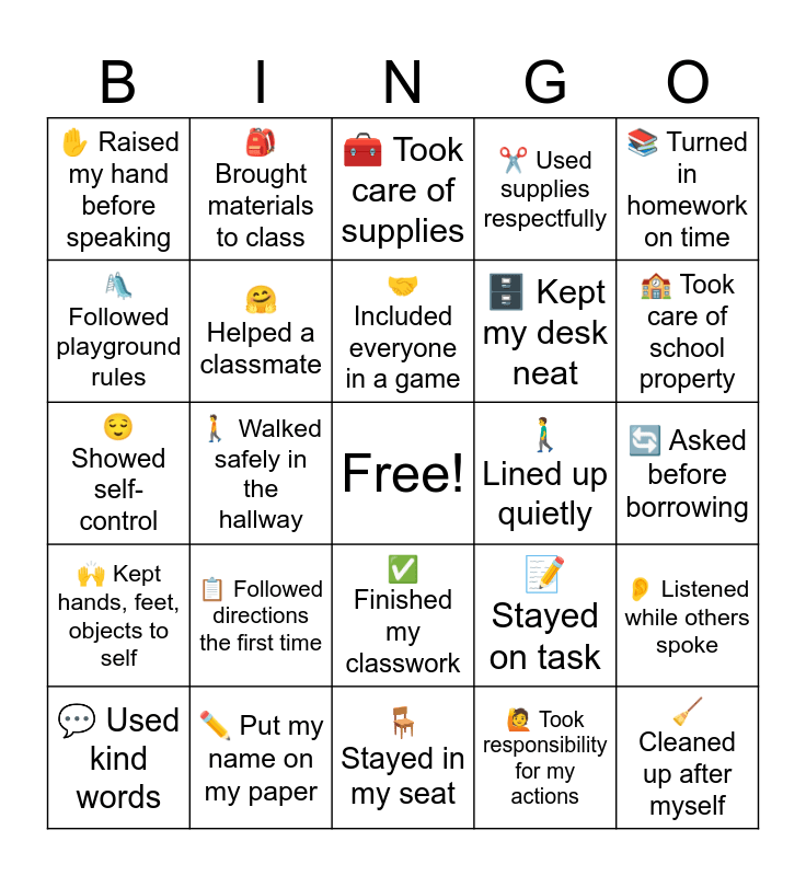 This bingo card has a free space and 24 words: π Followed directions the first time, βοΈ Put my name on my paper, π€ Included everyone in a game, π¬ Used kind words, π Turned in homework on time, β Raised my hand before speaking, π Followed playground rules, π Brought materials to class, πΆββοΈ Lined up quietly, β Finished my classwork, ποΈ Kept my desk neat, π Showed self-control, π Stayed on task, π Listened while others spoke, π€ Helped a classmate, π Took responsibility for my actions, π Asked before borrowing, π§° Took care of supplies, π« Took care of school property, πΆ Walked safely in the hallway, π§Ή Cleaned up after myself, π Kept hands, feet, objects to self, βοΈ Used supplies respectfully and πͺ Stayed in my seat.