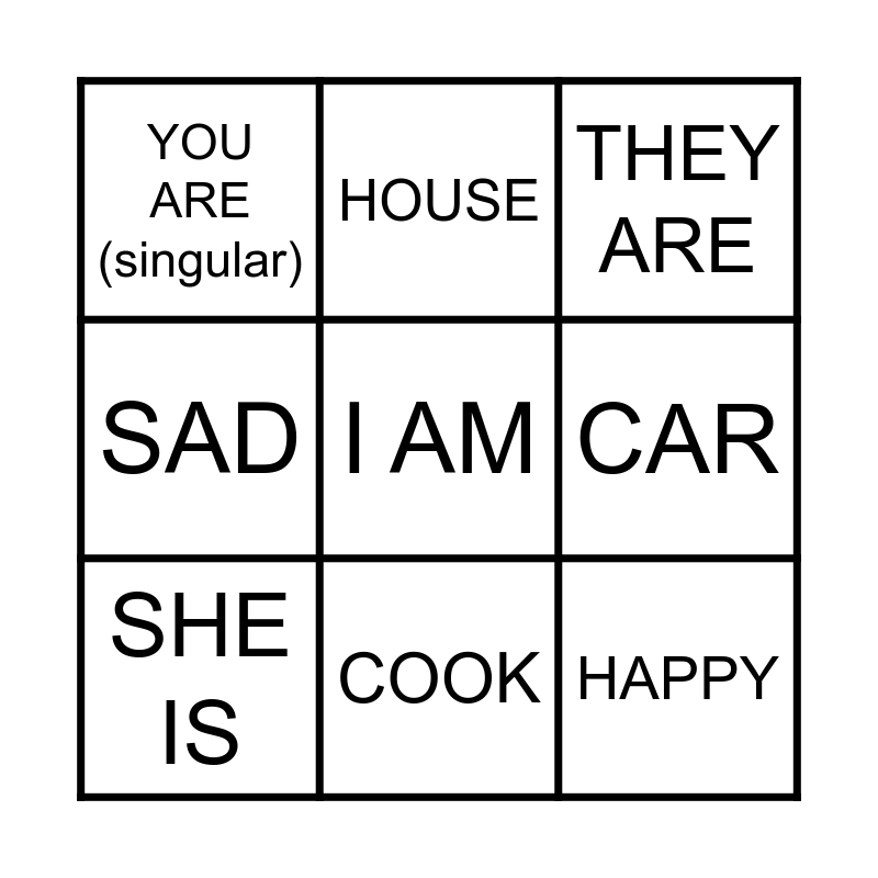 This bingo card has 9 words: SHE IS, THEY ARE, HOUSE, SAD, YOU ARE (singular), CAR, I AM, HAPPY and COOK.