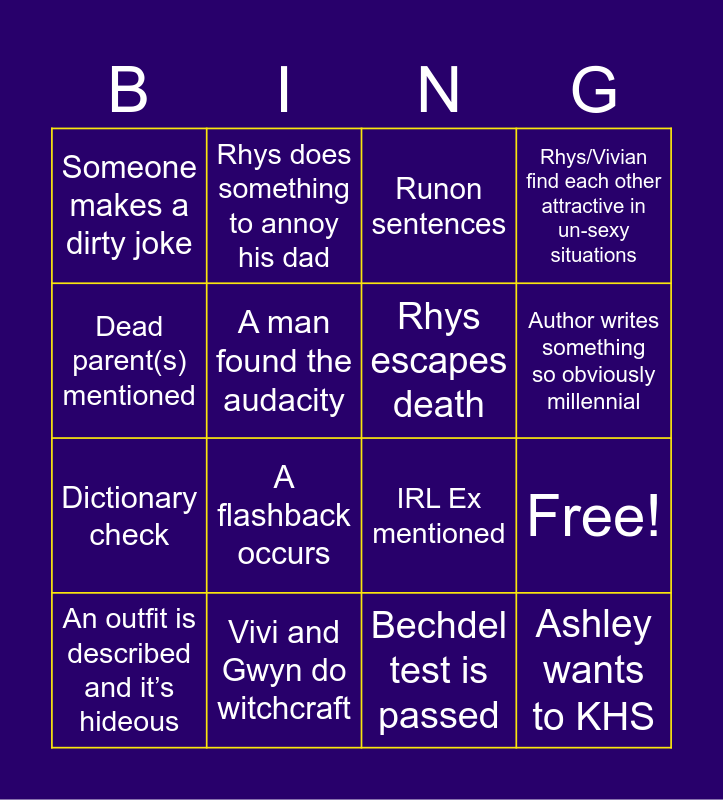 This bingo card has 20 words: Free!, Rhys has a dirty thought, Runon sentences, Reference to pop culture, An outfit is described and it’s hideous, Dead parent(s) mentioned, Vivi and Gwyn do witchcraft, Someone makes a dirty joke, Dictionary check, Rhys does something to annoy his dad, A flashback occurs, IRL Ex mentioned, A man found the audacity, Ashley wants to KHS, Rhys escapes death, Jane's phone / caffeine addiction mentioned, Author writes something so obviously millennial, Rhys/Vivian find each other attractive in un-sexy situations, Bechdel test is passed and A stereotype is used.