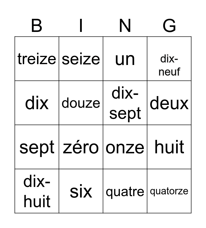 This bingo card has 21 words: six, neuf, seize, quinze, quatre, dix-sept, treize, un, onze, deux, sept, dix-neuf, quatorze, cinq, douze, trois, dix-huit, zéro, dix, huit and vingt.