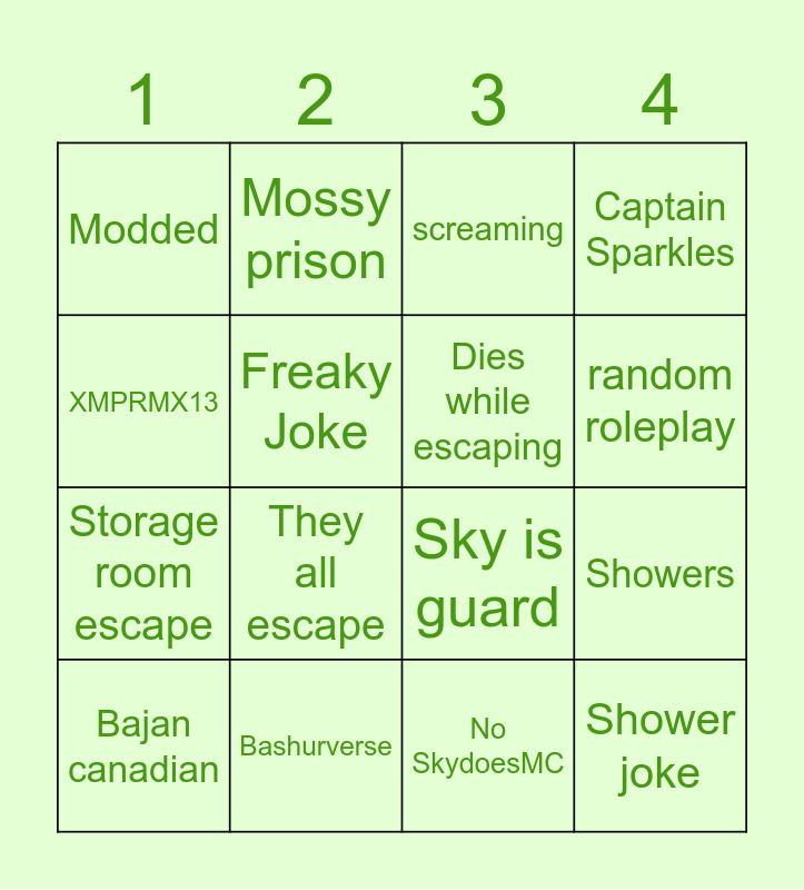 This bingo card has 20 words: Showers, Boxing ring, screaming, Captain Sparkles, Bajan canadian, XMPRMX13, Bashurverse, Modded, Storage room escape, Mossy prison, They all escape, Sky is guard, Freaky Joke, Shower joke, Dies while escaping, Guard wins, random roleplay, Captain Sparkles, No SkydoesMC and Uses Creative.