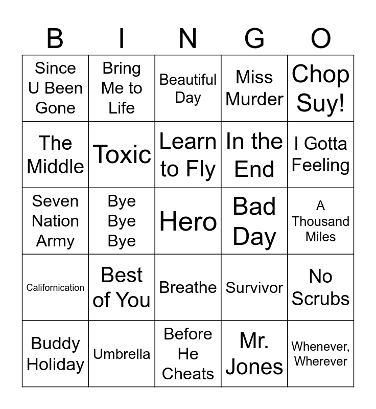 This bingo card has 30 words: Umbrella, Lose Yourself, Bye Bye Bye, Mr. Brightside, Since U Been Gone, Beautiful Day, Toxic, Breathe, Bad Day, Before He Cheats, A Thousand Miles, Hero, Mr. Jones, Whenever, Wherever, I Gotta Feeling, Lip Gloss, Survivor, Californication, Best of You, Chop Suy!, Seven Nation Army, Use Somebody, Bring Me to Life, In the End, The Middle, Miss Murder, No Scrubs, Buddy Holiday, Learn to Fly and Ironic.