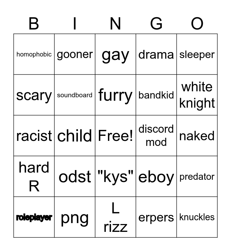 This bingo card has a free space and 29 words: egirl, png, gay, w rizz, sleeper, homophobic, soundboard, furry, discord mod, predator, roleplayer, child, erpers, knuckles, racist, kermit, L rizz, eboy, white knight, hard R, odst, cringe, bandkid, naked, scary, gooner, "kys", drama and full body.