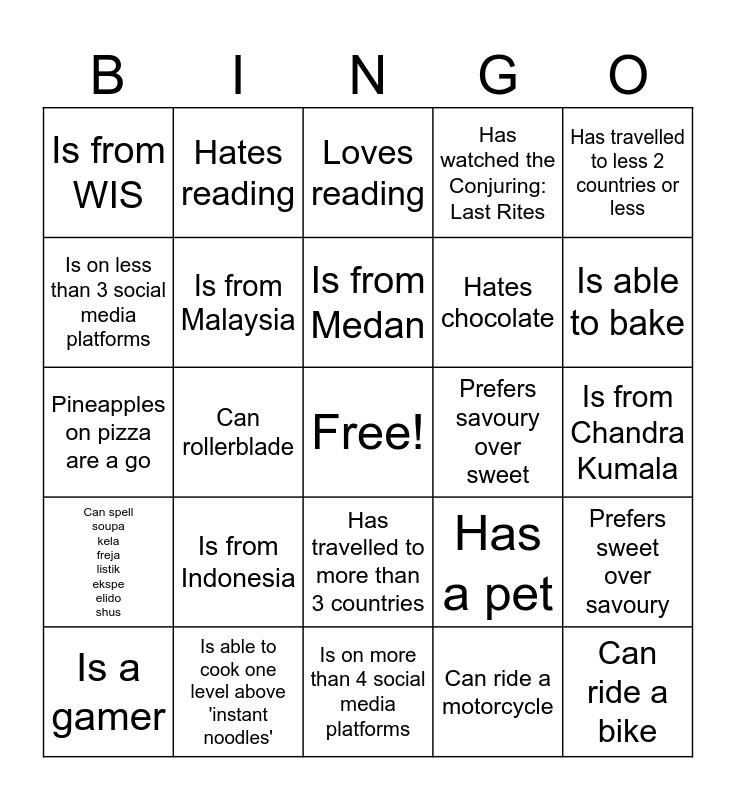 This bingo card has a free space and 27 words: Has a pet, Likes chocolate, Hates chocolate, Is on more than 4 social media platforms, Is on less than 3 social media platforms, Loves reading, Hates reading, Can spell soupa kela freja listik ekspe elido shus, Prefers savoury over sweet, Prefers sweet over savoury, Pineapples on pizza are a go, Has watched the Conjuring: Last Rites, Is a gamer, Is able to cook one level above 'instant noodles', Is able to bake, Is from Kampar, Is from Malaysia, Is from Medan, Is from Indonesia, Is from WIS, Is from Chandra Kumala, Can ride a motorcycle, Can rollerblade, Can ride a bike, Has travelled to more than 3 countries, Has travelled to less 2 countries or less and Prefers warm over cold.