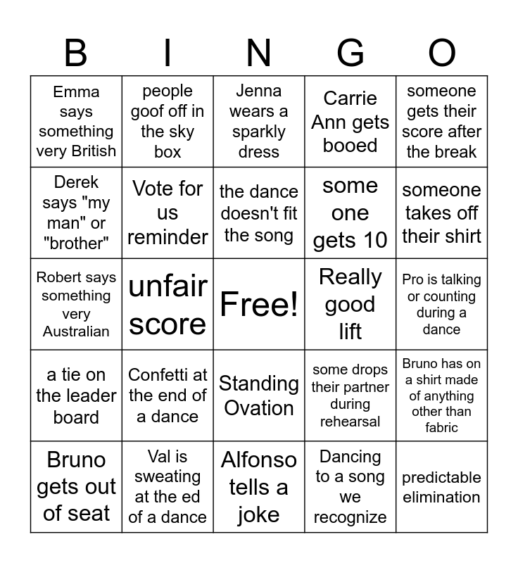 This bingo card has a free space and 29 words: Bruno gets out of seat, Jules wears "unique" dress, unfair score, partners hug each other after their dance, Emma says something very British, Jenna wears a sparkly dress, Vote for us reminder, Confetti at the end of a dance, Really good lift, Val is sweating at the ed of a dance, Pro is talking or counting during a dance, predictable elimination, Alfonso tells a joke, Dancing to a song we recognize, someone takes off their shirt, Bruno and Derek do something weird, Standing Ovation, a tie on the leader board, someone gets their score after the break, Robert says something very Australian, some drops their partner during rehearsal, past contestants are in the audience, some one gets 10, Derek says "my man" or "brother", Carrie Ann gets booed, people goof off in the sky box, Bruno has on a shirt made of anything other than fabric, the dance doesn't fit the song and score lower than an 8.