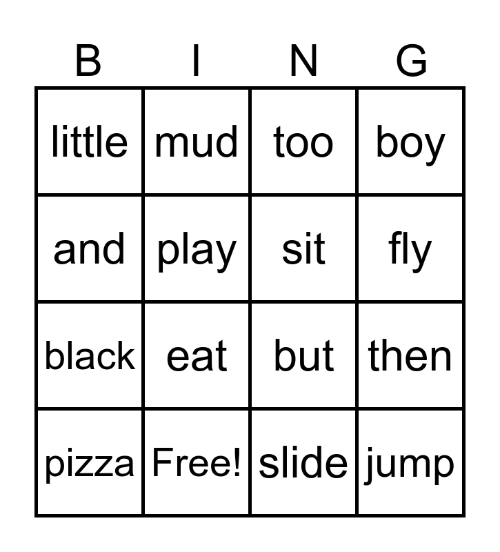 This bingo card has 21 words: Free!, bee, mud, grass, slide, sit, little, too, but, fly, black, boy, jump, run, play, fishing, pizza, eat, and, then and can.
