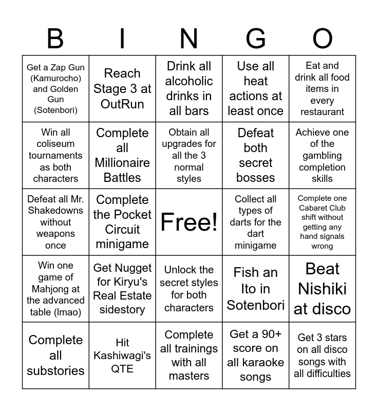 This bingo card has a free space and 24 words: Get Nugget for Kiryu's Real Estate sidestory, Hit Kashiwagi's QTE, Obtain all upgrades for all the 3 normal styles, Complete all substories, Eat and drink all food items in every restaurant, Get a Zap Gun (Kamurocho) and Golden Gun (Sotenbori), Win all coliseum tournaments as both characters, Reach Stage 3 at OutRun, Collect all types of darts for the dart minigame, Unlock the secret styles for both characters, Defeat both secret bosses, Defeat all Mr. Shakedowns without weapons once, Fish an Ito in Sotenbori, Beat Nishiki at disco, Complete all Millionaire Battles, Get a 90+ score on all karaoke songs, Complete one Cabaret Club shift without getting any hand signals wrong, Drink all alcoholic drinks in all bars, Achieve one of the gambling completion skills, Complete the Pocket Circuit minigame, Get 3 stars on all disco songs with all difficulties, Win one game of Mahjong at the advanced table (lmao), Use all heat actions at least once and Complete all trainings with all masters.