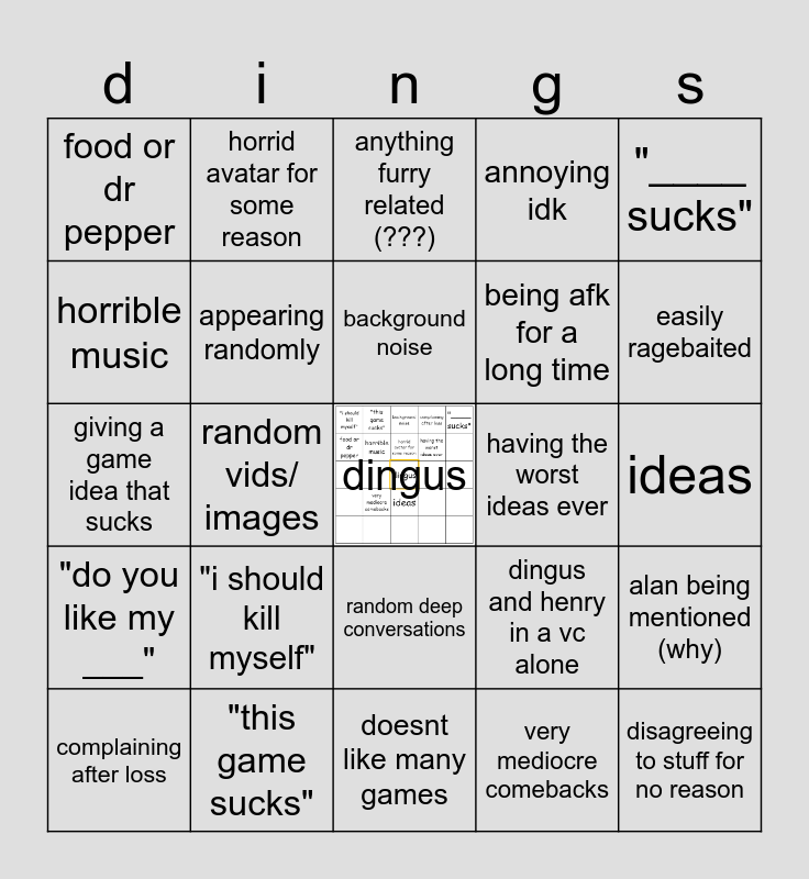 This bingo card has a free space and 24 words: "i should kill myself", "this game sucks", background noise, complaining after loss, "____ sucks", food or dr pepper, horrible music, horrid avatar for some reason, having the worst ideas ever, random deep conversations, being afk for a long time, giving a game idea that sucks, dingus and henry in a vc alone, alan being mentioned (why), appearing randomly, very mediocre comebacks, ideas, anything furry related (???), easily ragebaited, random vids/ images, disagreeing to stuff for no reason, "do you like my ___", annoying idk and doesnt like many games.