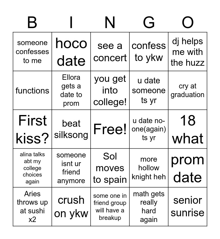This bingo card has a free space and 24 words: someone isnt ur friend anymore, crush on ykw, you get into college!, Aries throws up at sushi x2, dj helps me with the huzz, someone confesses to me, functions, hoco date, u date no-one(again) ts yr, Sol moves to spain, u date someone ts yr, First kiss?, more hollow knight heh, prom date, Ellora gets a date to prom, math gets really hard again, 18 what, see a concert, cry at graduation, beat silksong, senior sunrise, alina talks abt my college choices again, confess to ykw and some one in friend group will have a breakup.