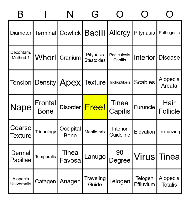 This bingo card has a free space and 48 words: 90 Degree, Interior, Traveling Guide, Frontal Bone, Apex, Hair Follicle, Terminal, Catagen, Pityriasis, Monilethrix, Pathogenic, Bacilli, Scabies, Trichoptilosis, Dermal Papillae, Furuncle, Decontam. Method 1, Disease, Virus, Allergy, Pediculosis Capitis, Disorder, Diameter, Whorl, Tinea, Cranium, Alopecia Areata, Alopecia Universalis, Texture, Density, Telogen Effluvium, Tinea Capitis, Texturizing, Temporalis, Nape, Interior Guideline, Elevation, Tension, Occipital Bone, Tinea Favosa, Coarse Texture, Alopecia Totalis, Cowlick, Anagen, Pityriasis Steatoides, Lanugo, Trichology and Telogen.