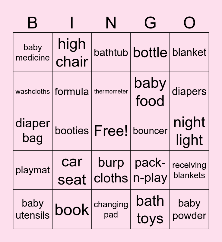 This bingo card has a free space and 44 words: monitor, baby powder, baby swing, baby utensils, bassinet, bath toys, bathtub, bib, blanket, book, bottle, bouncer, burp cloths, car seat, carrier, changing pad, crib, diaper bag, diaper cream, diapers, high chair, hooded towel, lotion, baby medicine, musical toy, night light, onesie, pacifier, pack-n-play, playmat, rattle, receiving blankets, sippy cup, sleep sack, booties, stroller, swaddle, teethers, thermometer, washcloths, baby food, milk, formula and nursery.