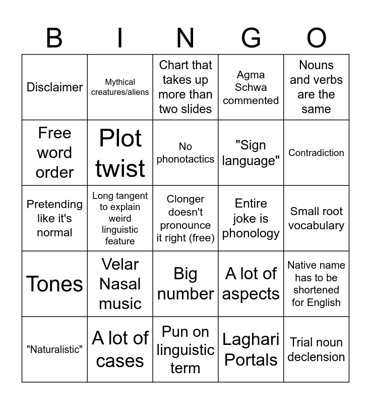 This bingo card has a free space and 24 words: Velar Nasal music, A lot of cases, No phonotactics, "Naturalistic", Nouns and verbs are the same, Disclaimer, Free word order, Mythical creatures/aliens, Entire joke is phonology, Big number, "Sign language", Pretending like it's normal, A lot of aspects, Native name has to be shortened for English, Plot twist, Laghari Portals, Small root vocabulary, Chart that takes up more than two slides, Contradiction, Long tangent to explain weird linguistic feature, Trial noun declension, Tones, Agma Schwa commented and Pun on linguistic term.