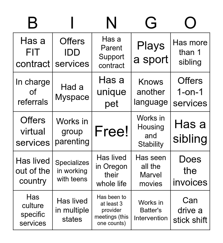This bingo card has a free space and 24 words: Specializes in working with teens, Has lived in multiple states, Has a unique pet, Has culture specific services, Has more than 1 sibling, Has a FIT contract, In charge of referrals, Offers IDD services, Works in Housing and Stability, Has lived in Oregon their whole life, Knows another language, Offers virtual services, Has seen all the Marvel movies, Does the invoices, Had a Myspace, Works in Batter's Intervention, Has a sibling, Has a Parent Support contract, Offers 1-on-1 services, Works in group parenting, Can drive a stick shift, Has lived out of the country, Plays a sport and Has been to at least 3 provider meetings (this one counts).