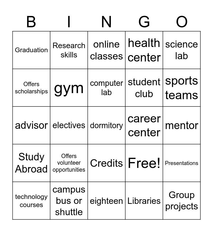 This bingo card has 25 words: Offers volunteer opportunities, eighteen, computer lab, technology courses, science lab, Graduation, Offers scholarships, Research skills, career center, Credits, student club, advisor, Free!, Presentations, gym, Group projects, mentor, online classes, sports teams, electives, dormitory, campus bus or shuttle, Study Abroad, health center and Libraries.