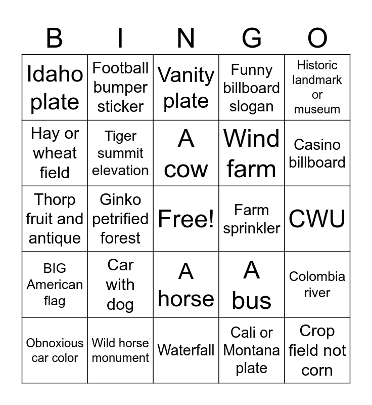This bingo card has a free space and 24 words: Car with dog, Wild horse monument, A cow, Obnoxious car color, Historic landmark or museum, Idaho plate, Hay or wheat field, Football bumper sticker, Farm sprinkler, A horse, Wind farm, Thorp fruit and antique, A bus, Colombia river, Tiger summit elevation, Cali or Montana plate, CWU, Vanity plate, Casino billboard, Ginko petrified forest, Crop field not corn, BIG American flag, Funny billboard slogan and Waterfall.