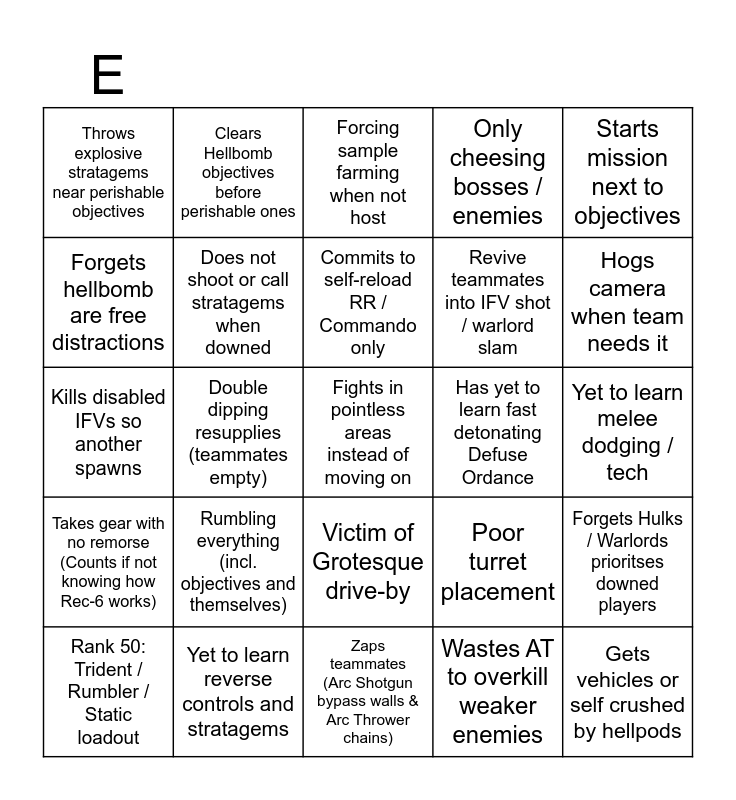 This bingo card has 25 words: Rumbling everything (incl. objectives and themselves), Zaps teammates (Arc Shotgun bypass walls & Arc Thrower chains), Commits to self-reload RR / Commando only, Rank 50: Trident / Rumbler / Static loadout, Starts mission next to objectives, Throws explosive stratagems near perishable objectives, Forgets hellbomb are free distractions, Clears Hellbomb objectives before perishable ones, Has yet to learn fast detonating Defuse Ordance, Victim of Grotesque drive-by, Revive teammates into IFV shot / warlord slam, Kills disabled IFVs so another spawns, Poor turret placement, Forgets Hulks / Warlords prioritses downed players, Does not shoot or call stratagems when downed, Gets vehicles or self crushed by hellpods, Yet to learn melee dodging / tech, Forcing sample farming when not host, Hogs camera when team needs it, Double dipping resupplies (teammates empty), Fights in pointless areas instead of moving on, Yet to learn reverse controls and stratagems, Takes gear with no remorse (Counts if not knowing how Rec-6 works), Only cheesing bosses / enemies and Wastes AT to overkill weaker enemies.