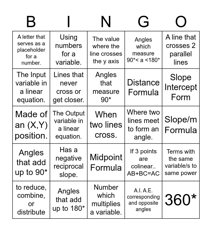 This bingo card has 26 words: Angles that add up to 90*, Angles that add up to 180*, Angles that measure 90*, A.I. A.E. corresponding and opposite angles, A line that crosses 2 parallel lines, A letter that serves as a placeholder for a number., Lines that never cross or get closer., The value where the line crosses the y axis, Distance Formula, 360*, The Input variable in a linear equation., The Output variable in a linear equation., Number which multiplies a variable., If 3 points are colinear.. AB+BC=AC, Slope/m Formula, Angles which measure 0*< a <90*, Using numbers for a variable., Midpoint Formula, Angles which measure 90*< a <180*, Terms with the same variable/s to same power, Made of an (X,Y) position., Has a negative reciprocal slope., When two lines cross., Where two lines meet to form an angle., Slope Intercept Form and to reduce, combine, or distribute.