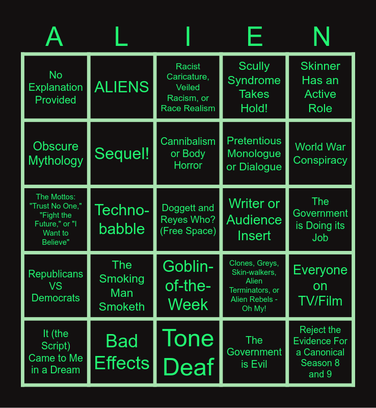 This bingo card has a free space and 24 words: The Smoking Man Smoketh, Bad Effects, Cannibalism or Body Horror, It (the Script) Came to Me in a Dream, Skinner Has an Active Role, No Explanation Provided, Obscure Mythology, ALIENS, Writer or Audience Insert, Goblin-of-the-Week, Pretentious Monologue or Dialogue, The Mottos: "Trust No One," "Fight the Future," or "I Want to Believe", Clones, Greys, Skin-walkers, Alien Terminators, or Alien Rebels - Oh My!, Everyone on TV/Film, Sequel!, The Government is Evil, The Government is Doing its Job, Racist Caricature, Veiled Racism, or Race Realism, World War Conspiracy, Techno-babble, Reject the Evidence For a Canonical Season 8 and 9, Republicans VS Democrats, Scully Syndrome Takes Hold! and Tone Deaf.