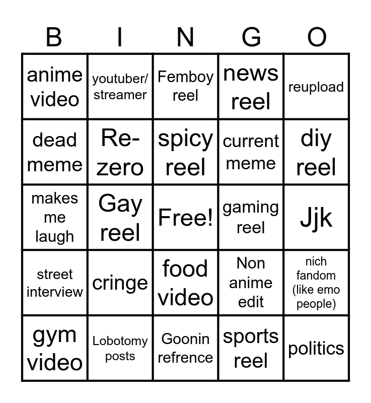 This bingo card has a free space and 24 words: cringe, Lobotomy posts, spicy reel, gym video, reupload, anime video, dead meme, youtuber/ streamer, gaming reel, food video, current meme, makes me laugh, Non anime edit, nich fandom (like emo people), Re-zero, sports reel, Jjk, Femboy reel, diy reel, Gay reel, politics, street interview, news reel and Goonin refrence.