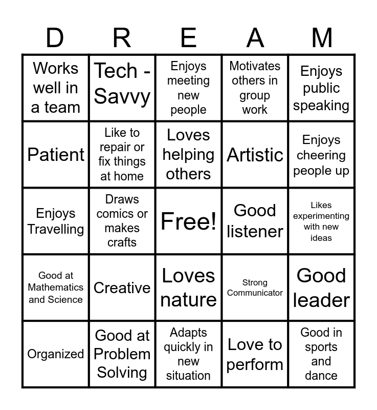 This bingo card has a free space and 24 words: Creative, Good at Problem Solving, Loves helping others, Organized, Enjoys public speaking, Works well in a team, Patient, Tech - Savvy, Good listener, Loves nature, Artistic, Enjoys Travelling, Strong Communicator, Good leader, Like to repair or fix things at home, Love to perform, Likes experimenting with new ideas, Enjoys meeting new people, Enjoys cheering people up, Draws comics or makes crafts, Good in sports and dance, Good at Mathematics and Science, Motivates others in group work and Adapts quickly in new situation.