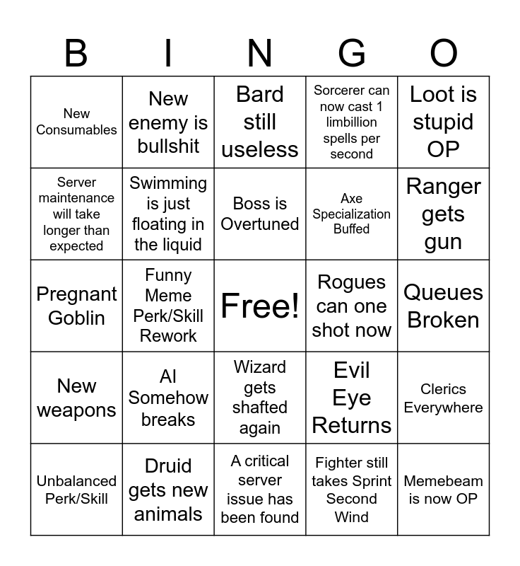 This bingo card has a free space and 24 words: AI Somehow breaks, Druid gets new animals, Boss is Overtuned, Unbalanced Perk/Skill, Loot is stupid OP, New Consumables, Server maintenance will take longer than expected, New enemy is bullshit, Rogues can one shot now, Wizard gets shafted again, Axe Specialization Buffed, Pregnant Goblin, Evil Eye Returns, Clerics Everywhere, Swimming is just floating in the liquid, Fighter still takes Sprint Second Wind, Queues Broken, Bard still useless, Ranger gets gun, Funny Meme Perk/Skill Rework, Memebeam is now OP, New weapons, Sorcerer can now cast 1 limbillion spells per second and A critical server issue has been found.