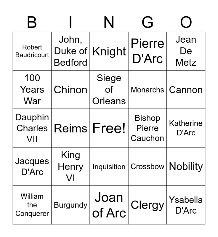 This bingo card has a free space and 40 words: Domremy, Dauphin Charles VII, Vaucouleurs, Chinon, Burgundy, Inquisition, Siege of Orleans, La Hire, Jean De Metz, Jacques D'Arc, Reims, Pierre D'Arc, Ysabella D'Arc, Katherine D'Arc, Bishop Pierre Cauchon, King Henry VI, St Catherine's Sword, Robert Baudricourt, Peasant, Knight, Nobility, Clergy, Monarchs, 100 Years War, Feudal System, Pope, Heraldry, Merchants, Heresy, 1337, 1453, William the Conquerer, Longbow, Crossbow, Cannon, Joan of Arc, Code of Chivalry, Regent, John, Duke of Bedford and Phillip of Burgundy.