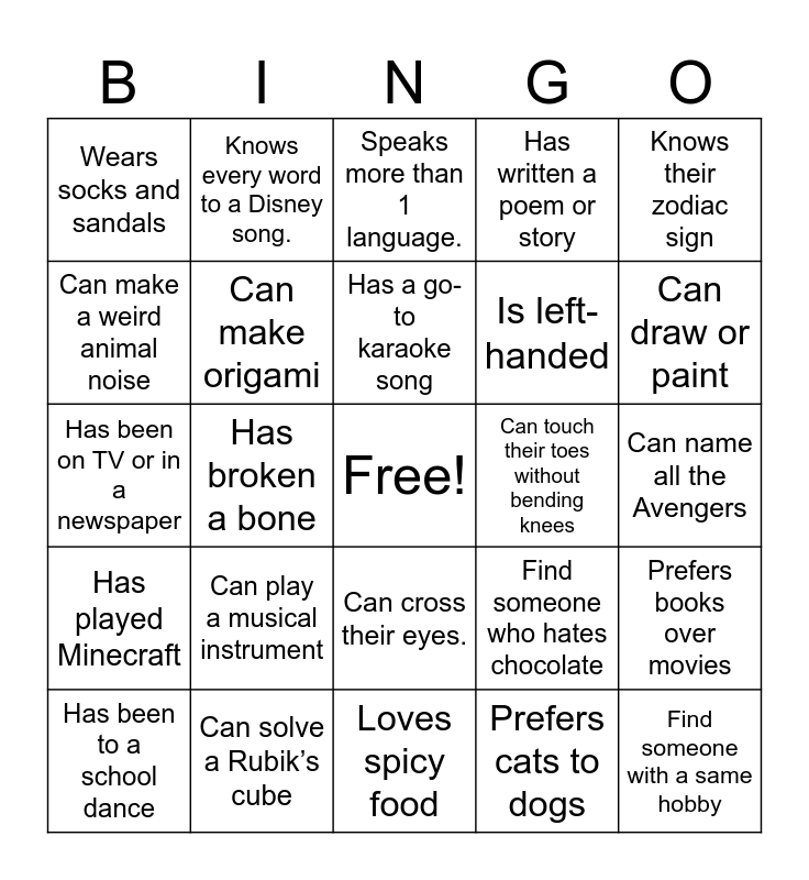 This bingo card has a free space and 99 words: Has traveled to another country., Favorite subject is Math., Has met someone famous., Speaks more than 1 language., Can sing the alphabet backwards., Can do a Chewbacca impression., Can whistle loudly., Can wiggle their ears., Has a funny nickname., Love pineapple on pizza., Knows a TikTok dance., Doesn’t like ranch., Knows how to moonwalk., Can cross their eyes., Knows a random fun fact., Wears socks and sandals, Knows every word to a Disney song., Knows a dad joke., Can hula hoop, Loves dipping fries in a milkshake., Has prank called someone., Can’t whistle., Can touch their nose to their tongue., Loves rainy days, Is a morning person, Prefers books over movies, Has a go-to karaoke song, Thinks pineapple belongs on pizza, Would rather stay in than go out, Believes in horoscopes, Loves spicy food, Prefers cats to dogs, Has traveled to another continent, Has met someone famous, Has broken a bone, Has been on TV or in a newspaper, Has gone camping in the last year, Has ridden a horse, Has pulled an all-nighter, Can play a musical instrument, Knows how to juggle, Can draw or paint, Has written a poem or story, Can solve a Rubik’s cube, Loves building things, Is really good at trivia, Enjoys board games more than video games, Can sew or knit, Has run a marathon or race, Find someone who's never eaten shrimp, Find someone with the same favorite color as you, Find someone with a same hobby, Find someone who hates chocolate, Find someone who can individually raise both eyebrows, Is the only child in the family, Find someone who plays in band, Find someone with 2 different colored eyes, Find someone with a name that starts with the same letter as you, Can name all 4 Hogwarts houses, Has watched every Harry Potter movie, Still has a stuffed animal from childhood, Has the same birth month as you, Can do a cartwheel, Has had braces, Has been on a rollercoaster, Knows their zodiac sign, Can name 10+ Pokémon, Has dyed their hair before, Has a fear of spiders, Has played Minecraft, Can snap with both hands, Is left-handed, Can make a weird animal noise, Doesn’t like pizza, Can say “hello” in 3 or more languages, Has the same favorite ice cream flavor as you, Can make origami, Has a twin (or is a twin), Has gone viral on social media (even a little), Has binge-watched a full series in one weekend, Can touch their toes without bending knees, Has been to a concert, Can list all the planets in order, Can do a handstand, Has more than 3 siblings, Can roll their tongue, Is allergic to something unusual, Uses way too many emojis when texting 😂, Can name all the Avengers, Has been to a school dance, Still knows their 5th-grade teacher's name, Can rap a full verse of a song, Has worn mismatched socks on purpose, Can do a backbend or bridge, Is in student council or leadership, Has made a friendship bracelet this year, Loves to journal or scrapbook, Can say the alphabet in another language and Has a collection (e.g., rocks, stickers, coins).