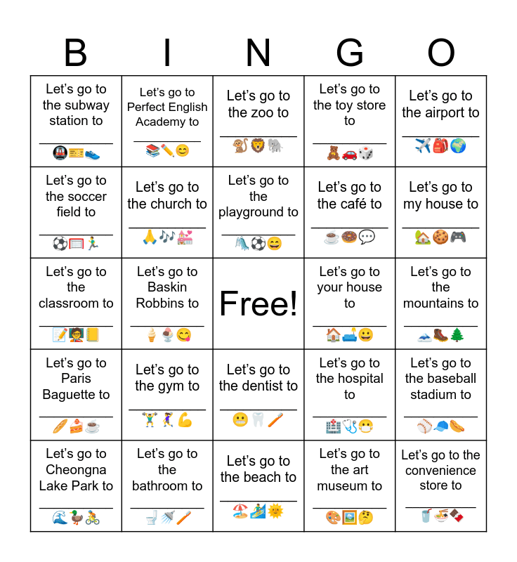 This bingo card has a free space and 33 words: Letโs go to the park to __________ ๐ณ๐๐, Letโs go to Homeplus to __________ ๐๐ฅ๐ช, Letโs go to Baskin Robbins to __________ ๐ฆ๐จ๐, Letโs go to Everland to __________ ๐ข๐ก๐ฏ, Letโs go to Paris Baguette to __________ ๐ฅ๐ฐโ, Letโs go to the church to __________ ๐๐ถ๐, Letโs go to the airport to __________ โ๏ธ๐๐, Letโs go to Cheongna Lake Park to __________ ๐๐ฆ๐ด, Letโs go to Perfect English Academy to __________ ๐โ๏ธ๐, Letโs go to the library to __________ ๐๐ค๐, Letโs go to the playground to __________ ๐โฝ๐, Letโs go to the zoo to __________ ๐๐ฆ๐, Letโs go to the swimming pool to __________ ๐โโ๏ธ๐ฆ๐, Letโs go to the movie theater to __________ ๐ฌ๐ฟ๐ฅค, Letโs go to your house to __________ ๐ ๐๏ธ๐, Letโs go to my house to __________ ๐ก๐ช๐ฎ, Letโs go to the bathroom to __________ ๐ฝ๐ฟ๐ชฅ, Letโs go to the classroom to __________ ๐๐งโ๐ซ๐, Letโs go to the gym to __________ ๐๏ธโโ๏ธ๐คพโโ๏ธ๐ช, Letโs go to the hospital to __________ ๐ฅ๐ฉบ๐ท, Letโs go to the dentist to __________ ๐ฌ๐ฆท๐ชฅ, Letโs go to the bus stop to __________ ๐๐๐ฑ, Letโs go to the subway station to __________ ๐๐ซ๐, Letโs go to the mountains to __________ ๐ป๐ฅพ๐ฒ, Letโs go to the beach to __________ ๐๏ธ๐โโ๏ธ๐, Letโs go to the convenience store to __________ ๐ฅค๐๐ซ, Letโs go to the toy store to __________ ๐งธ๐๐ฒ, Letโs go to the cafรฉ to __________ โ๐ฉ๐ฌ, Letโs go to the soccer field to __________ โฝ๐ฅ ๐โโ๏ธ, Letโs go to the baseball stadium to __________ โพ๐งข๐ญ, Letโs go to the music academy to __________ ๐น๐ถ๐ค, Letโs go to the art museum to __________ ๐จ๐ผ๏ธ๐ค and Letโs go to the science museum to __________ ๐ฌ๐งช๐ฐ๏ธ.