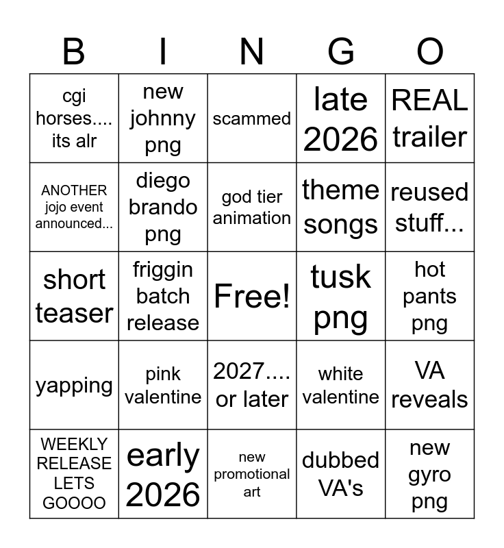 This bingo card has a free space and 24 words: pink valentine, early 2026, god tier animation, WEEKLY RELEASE LETS GOOOO, REAL trailer, cgi horses.... its alr, ANOTHER jojo event announced..., new johnny png, tusk png, 2027.... or later, theme songs, short teaser, white valentine, VA reveals, diego brando png, dubbed VA's, hot pants png, scammed, reused stuff..., friggin batch release, new gyro png, yapping, late 2026 and new promotional art.