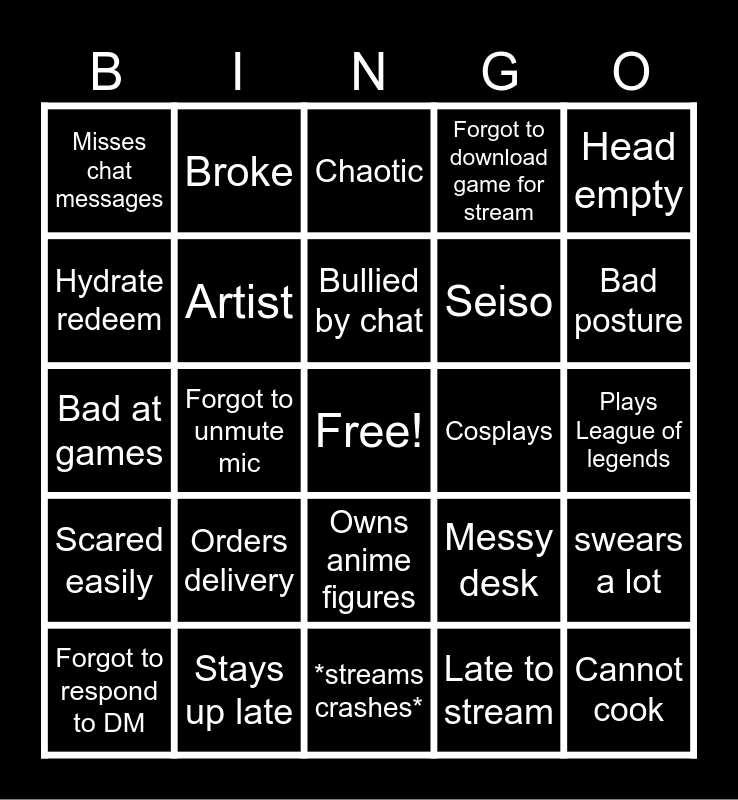 This bingo card has a free space and 24 words: Orders delivery, Stays up late, Bullied by chat, Forgot to respond to DM, Head empty, Misses chat messages, Hydrate redeem, Broke, Cosplays, Owns anime figures, Seiso, Bad at games, Messy desk, swears a lot, Artist, Late to stream, Plays League of legends, Chaotic, Bad posture, Forgot to unmute mic, Cannot cook, Scared easily, Forgot to download game for stream and *streams crashes*.