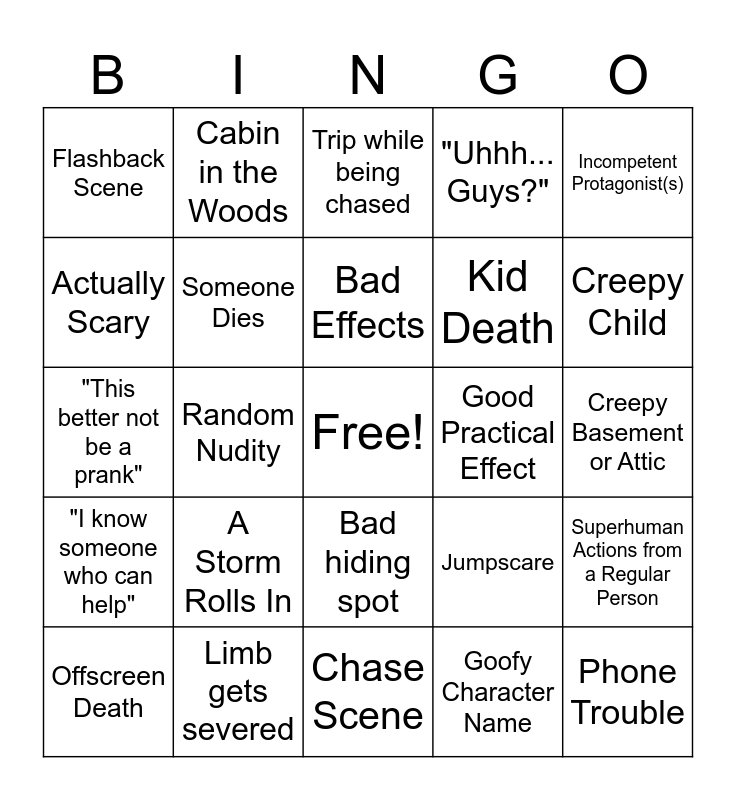 This bingo card has a free space and 52 words: Car Trouble, Phone Trouble, Dead Pet, Chase Scene, A Storm Rolls In, Useless Cops, Cabin in the Woods, Creepy Old Person, Actually Scary, Séance/Ouija Board Scene, Someone Dies, Supernatural Antagonist, Superhuman Actions from a Regular Person, Jumpscare, Jumpscare of something not scary, CGI Blood, Bad Effects, Good Practical Effect, Antagonist isn't actually dead, Incompetent Protagonist(s), Random Nudity, Goofy Character Name, Flashback Scene, Kid Death, Random Character with needed exposition, Bad Acting, Movie Title Drop, Flashlight Scene, Creepy Child, Someone does the nasty, "Ill be right back", "Uhhh... Guys?", Banshee Scream, Argument gets interrupted, Antagonist POV, Trip while being chased, Limb gets severed, Love Interest, Door is locked, Mysterious Phone Call, Drugs/Alcohol, Creepy Basement or Attic, "I know someone who can help", Inexplicable split up, Bad hiding spot, Treats red flags like checkpoints, Creepy Toy/Doll, "This better not be a prank", Poltergeist behavior, Tell Don't Show, Offscreen Death and Almost Movie Title Drop.