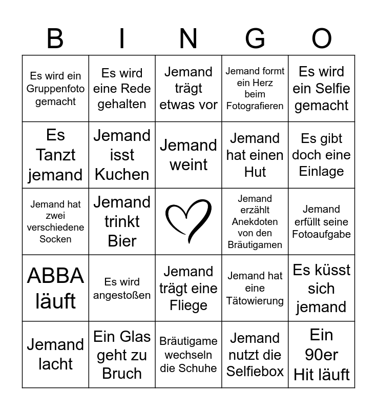 This bingo card has a free space and 24 words: Es wird angestoßen, Ein Glas geht zu Bruch, Jemand weint, Jemand lacht, Es wird ein Selfie gemacht, Es wird ein Gruppenfoto gemacht, Es Tanzt jemand, Es wird eine Rede gehalten, Jemand erzählt Anekdoten von den Bräutigamen, Jemand trägt eine Fliege, Jemand hat einen Hut, Jemand hat zwei verschiedene Socken, Jemand hat eine Tätowierung, Es küsst sich jemand, Jemand isst Kuchen, Jemand nutzt die Selfiebox, Jemand erfüllt seine Fotoaufgabe, Jemand trägt etwas vor, Es gibt doch eine Einlage, Jemand trinkt Bier, Ein 90er Hit läuft, ABBA läuft, Jemand formt ein Herz beim Fotografieren and Bräutigame wechseln die Schuhe.