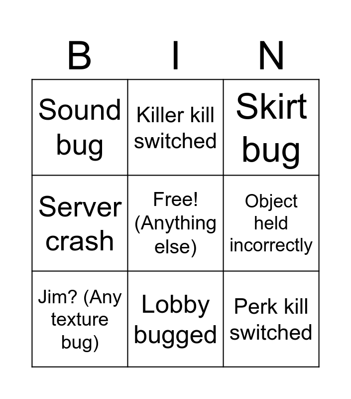 This bingo card has a free space and 9 words: Jim? (Any texture bug), Skirt bug, Killer kill switched, Server crash, Sound bug, Object held incorrectly, Perk kill switched, Game crash and Lobby bugged.