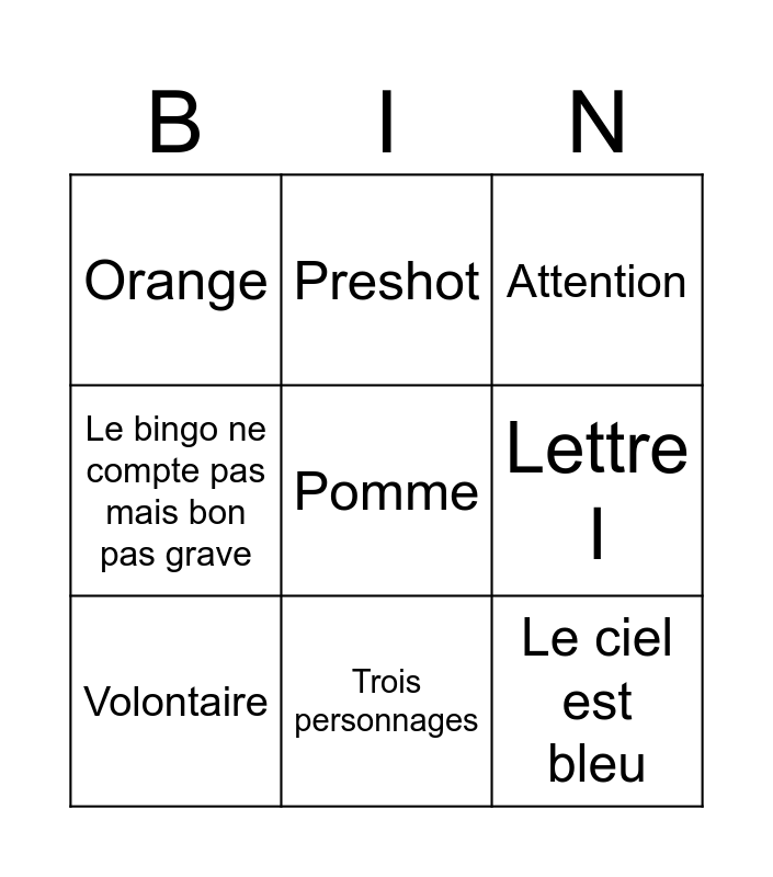 This bingo card has a free space and 8 words: Lettre I, Attention, Preshot, Volontaire, Orange, Le ciel est bleu, Le bingo ne compte pas mais bon pas grave and Trois personnages.