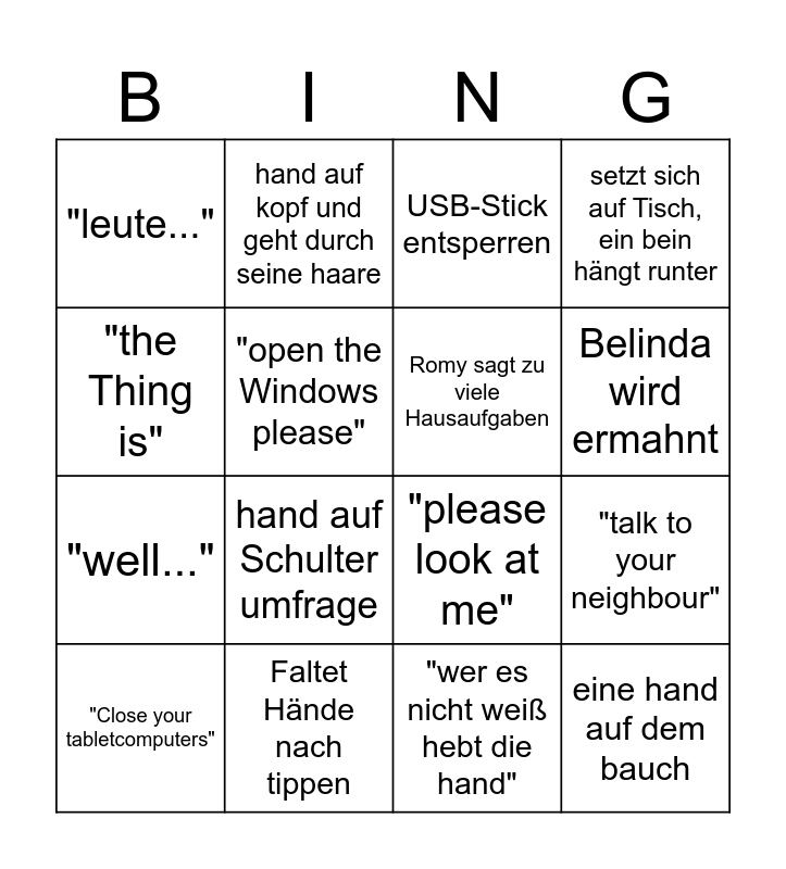 This bingo card has 16 words: Faltet Hände nach tippen, "talk to your neighbour", USB-Stick entsperren, "leute...", "well...", hand auf kopf und geht durch seine haare, "please look at me", "wer es nicht weiß hebt die hand", "the Thing is", "open the Windows please", "Close your tabletcomputers", setzt sich auf Tisch, ein bein hängt runter, hand auf Schulter umfrage, Belinda wird ermahnt, Romy sagt zu viele Hausaufgaben and eine hand auf dem bauch.