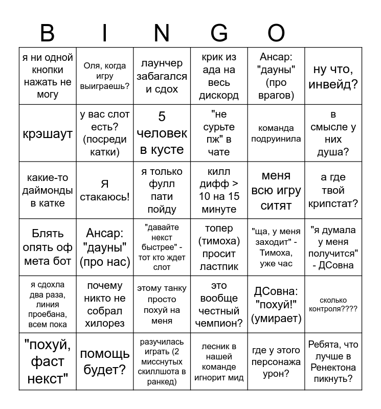 This bingo card has 36 words: это вообще честный чемпион?, этому танку просто похуй на меня, лесник в нашей команде игнорит мид, крэшаут, Блять опять оф мета бот, килл дифф > 10 на 15 минуте, у вас слот есть? (посреди катки), разучилась играть (2 мисснутых скиллшота в ранкед), Ансар: "дауны" (про врагов), ДСовна: "похуй!" (умирает), в смысле у них душа?, крик из ада на весь дискорд, сколько контроля????, Я стакаюсь!, "не сурьте пж" в чате, я ни одной кнопки нажать не могу, я сдохла два раза, линия проебана, всем пока, меня всю игру ситят, какие-то даймонды в катке, лаунчер забагался и сдох, я только фулл пати пойду, Ансар: "дауны" (про нас), топер (тимоха) просит ластпик, "давайте некст быстрее" - тот кто ждет слот, "ща, у меня заходит" - Тимоха, уже час, Оля, когда игру выиграешь?, команда подруинила, помощь будет?, 5 человек в кусте, ну что, инвейд?, Ребята, что лучше в Ренектона пикнуть?, "похуй, фаст некст", "я думала у меня получится" - ДСовна, а где твой крипстат?, почему никто не собрал хилорез and где у этого персонажа урон?.