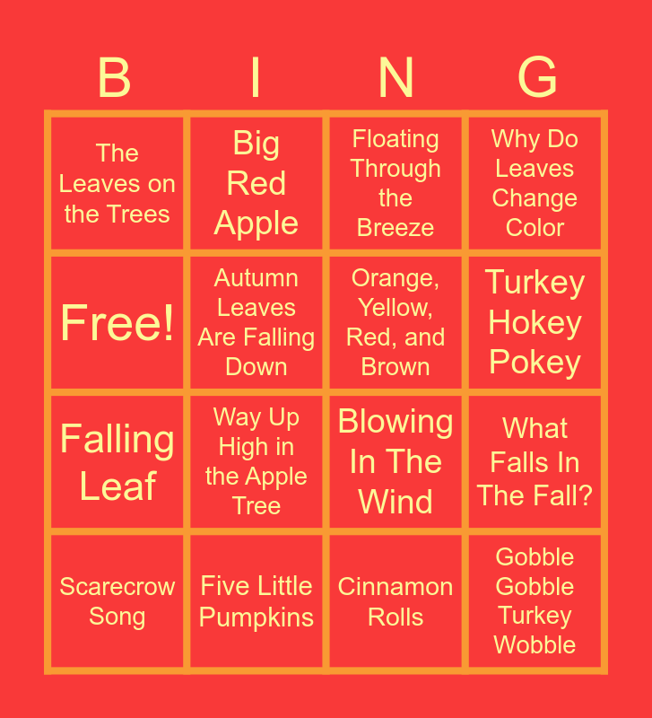 This bingo card has 16 words: Five Little Pumpkins, What Falls In The Fall?, Floating Through the Breeze, The Leaves on the Trees, Falling Leaf, Big Red Apple, Blowing In The Wind, Cinnamon Rolls, Free!, Autumn Leaves Are Falling Down, Scarecrow Song, Why Do Leaves Change Color, Way Up High in the Apple Tree, Turkey Hokey Pokey, Orange, Yellow, Red, and Brown and Gobble Gobble Turkey Wobble.
