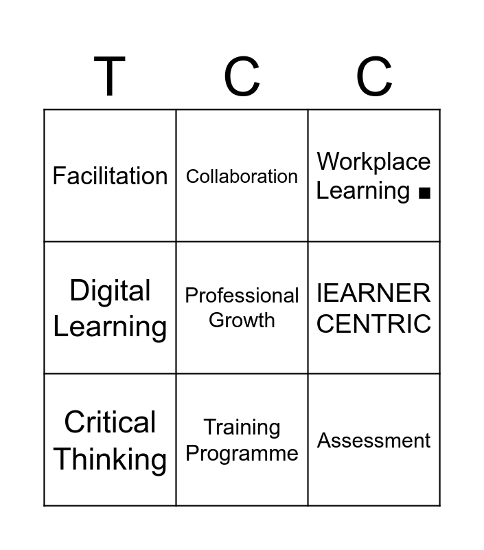 This bingo card has a free space and 10 words: Training Programme, Workplace Learning ■, Facilitation, Assessment, Digital Learning, Critical Thinking, Collaboration, ommunication, lEARNER CENTRIC and ■■■Competency.
