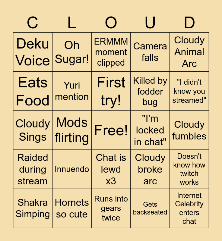 This bingo card has a free space and 24 words: Innuendo, Hornets so cute, First try!, Shakra Simping, Cloudy Animal Arc, Deku Voice, Eats Food, Oh Sugar!, "I'm locked in chat", Chat is lewd x3, Killed by fodder bug, Cloudy Sings, Cloudy broke arc, Doesn't know how twitch works, Yuri mention, Gets backseated, Cloudy fumbles, ERMMM moment clipped, "I didn't know you streamed", Mods flirting, Internet Celebrity enters chat, Raided during stream, Camera falls and Runs into gears twice.