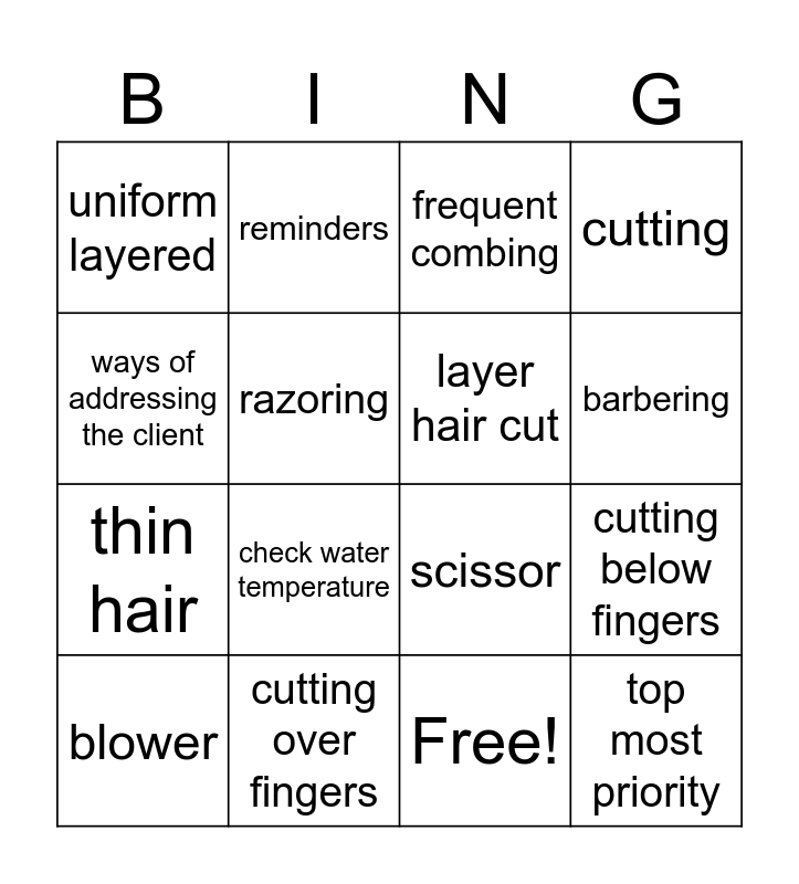 This bingo card has 17 words: Free!, blower, frequent combing, uniform layered, check water temperature, cutting, cutting below fingers, layer hair cut, barbering, razoring, cutting over fingers, scissor, ways of addressing the client, reminders, thin hair, assess the clients hair cutting needs and top most priority.