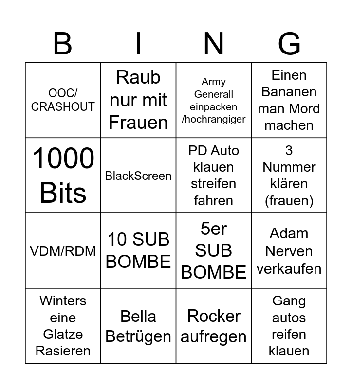 This bingo card has 16 words: Bella Betrügen, Adam Nerven verkaufen, Army Generall einpacken /hochrangiger, OOC/ CRASHOUT, VDM/RDM, Raub nur mit Frauen, 5er SUB BOMBE, Rocker aufregen, 1000 Bits, BlackScreen, Winters eine Glatze Rasieren, Einen Bananen man Mord machen, 10 SUB BOMBE, 3 Nummer klären (frauen), PD Auto klauen streifen fahren and Gang autos reifen klauen.