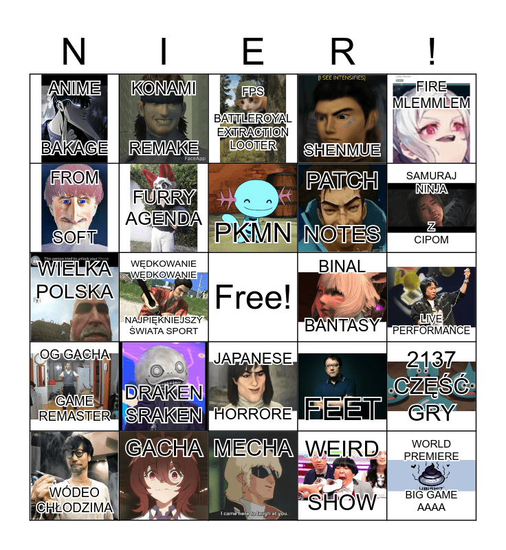 This bingo card has 24 images, a free space and 24 words: DRAKEN SRAKEN, GACHA, PKMN, WÓDEO CHŁODZIMA, FIRE MLEMMLEM, ANIME BAKAGE, FROM SOFT, KONAMI REMAKE, BINAL BANTASY, JAPANESE HORRORE, PATCH NOTES, WIELKA POLSKA, FEET, 2137 CZĘŚĆ GRY, FURRY AGENDA, WEIRD SHOW, LIVE PERFORMANCE, FPS BATTLEROYAL EXTRACTION LOOTER, SAMURAJ NINJA Z CIPOM, WĘDKOWANIE WĘDKOWANIE NAJPIĘKNIEJSZY ŚWIATA SPORT, WORLD PREMIERE BIG GAME AAAA, OG GACHA GAME REMASTER, SHENMUE and MECHA.