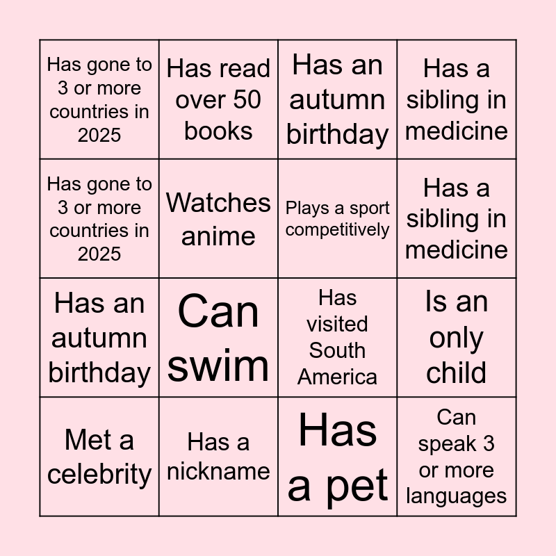 ⚠ This card has duplicate items: Has visited South America (2), Is an only child (2), Is left handed (2), Can speak 3 or more languages (2), Plays a sport competitively (2), Has gone to 3 or more countries in 2025 (2), Has a pet (2), Has read over 50 books (2), Met a celebrity (2), Has a sibling in medicine (2), Has an autumn birthday (2), Watches anime (2), Supports a Manchester premier league team (2), Has a nickname (2), Can swim (2), Doesn't drink coffee (2)