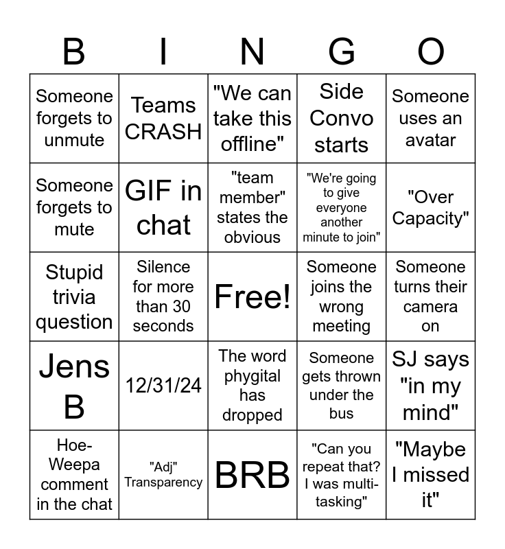 This bingo card has a free space and 24 words: 12/31/24, "Adj" Transparency, "team member" states the obvious, Hoe-Weepa comment in the chat, Someone uses an avatar, Someone forgets to unmute, Someone forgets to mute, Teams CRASH, Someone joins the wrong meeting, The word phygital has dropped, "We're going to give everyone another minute to join", Stupid trivia question, Someone gets thrown under the bus, SJ says "in my mind", GIF in chat, "Can you repeat that? I was multi-tasking", Someone turns their camera on, "We can take this offline", "Over Capacity", Silence for more than 30 seconds, "Maybe I missed it", Jens B, Side Convo starts and BRB.