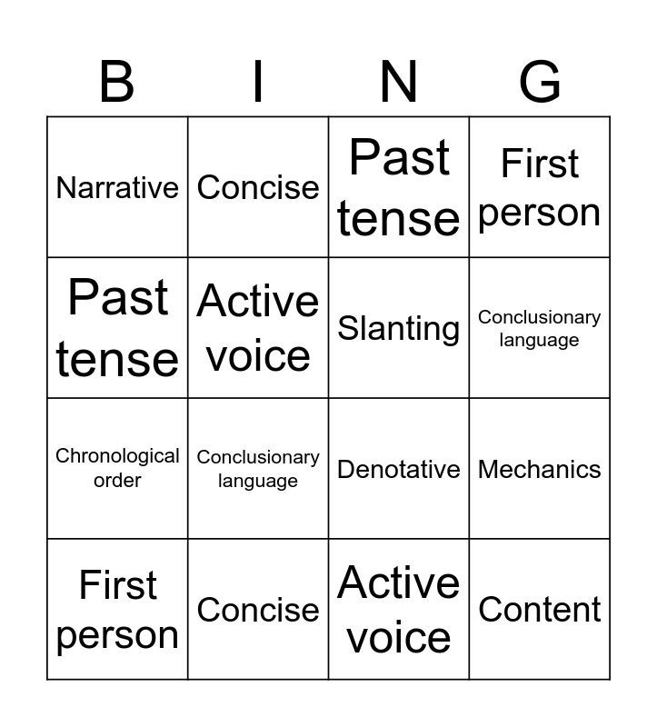 This bingo card has 31 words: Free!, Form, Mechanics, Content, Narrative, Past tense, Slanting, Objective, Concise, Chronological order, Active voice, First person, Denotative, connotative, Conclusionary language, proofread, Form, Mechanics, Content, Narrative, Past tense, Slanting, Objective, Concise, Chronological order, Active voice, First person, Denotative, connotative, Conclusionary language and proofread.