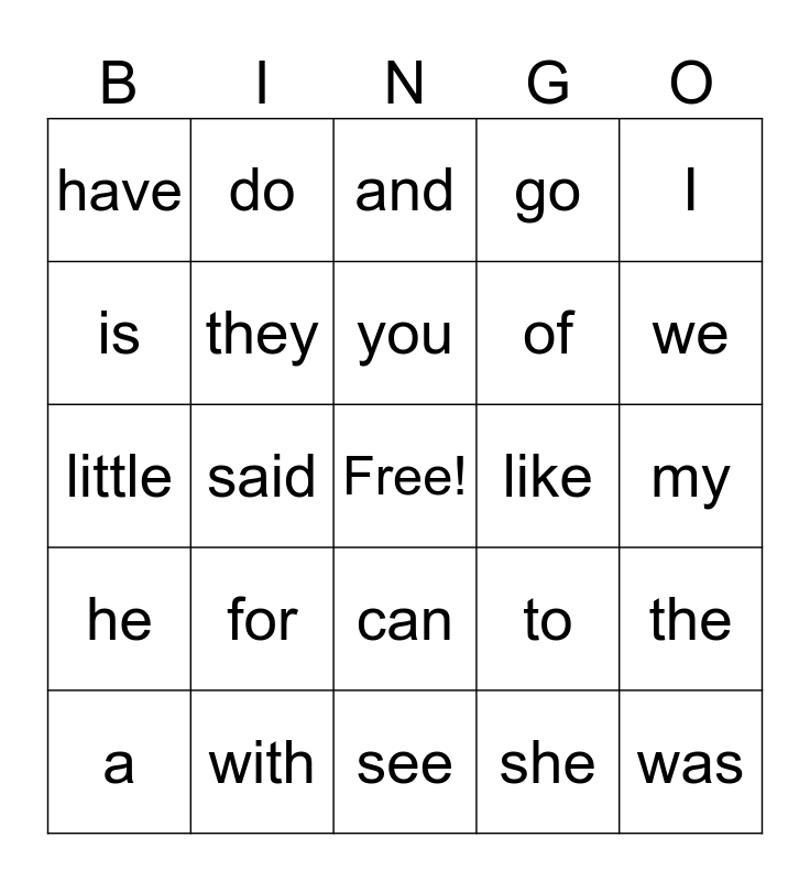 This bingo card has a free space and 24 words: for, with, you, a, I, have, is, do, like, can, of, little, to, the, they, she, my, and, we, said, was, he, go and see.